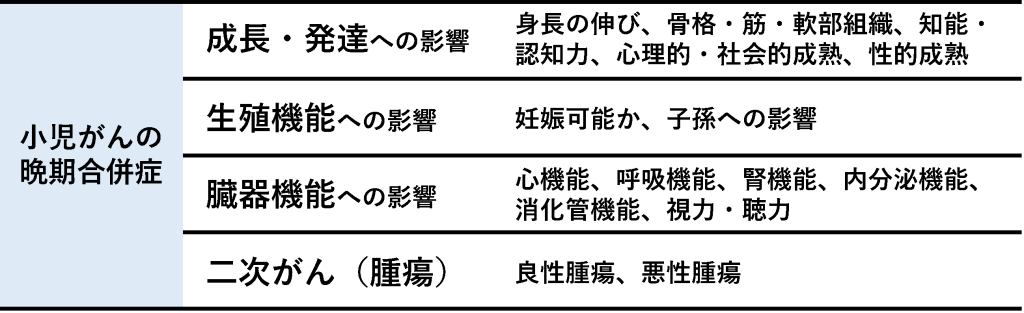 晩期合併症とは…お子さまが発育途中であることなどから、 成長や時間の経過に伴って、がん(腫瘍) そのものからの影響や、薬物療法、放射線治療など治療の影響によって生じる合併症 がみられます。これを「晩期合併症(晩期障がい)」といい ます。