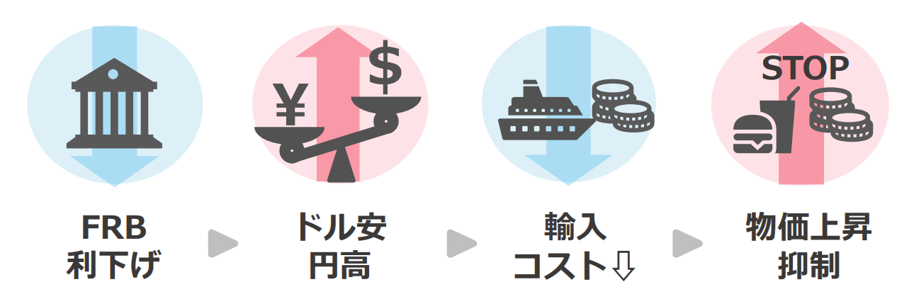 利下げによってドル安円高が進行すると、日本の輸入コストが低下し国内の物価上昇が抑制される可能性があります。