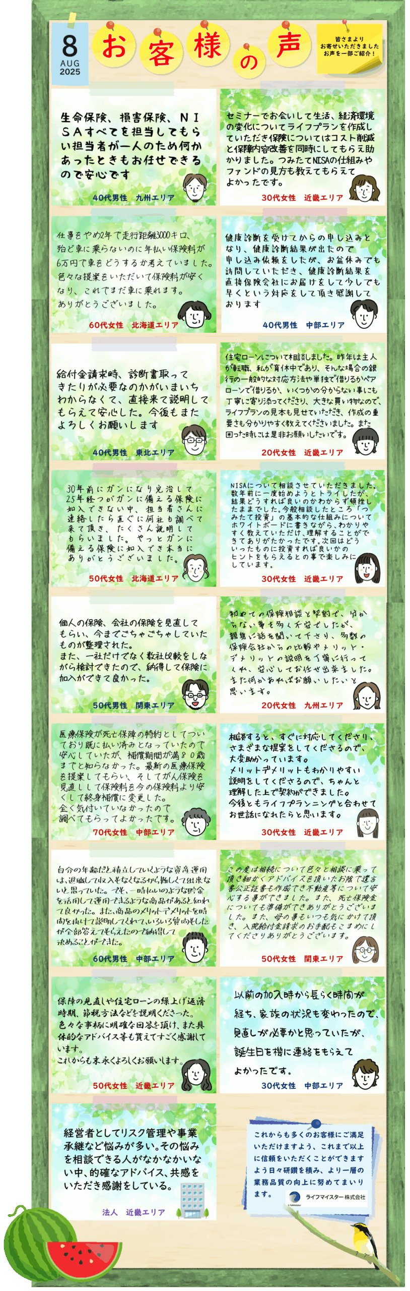 地域・年代・性別問わず たくさんのお客様よりいただきましたご回答の中の「声」の一部をピックアップし、毎月こちらに