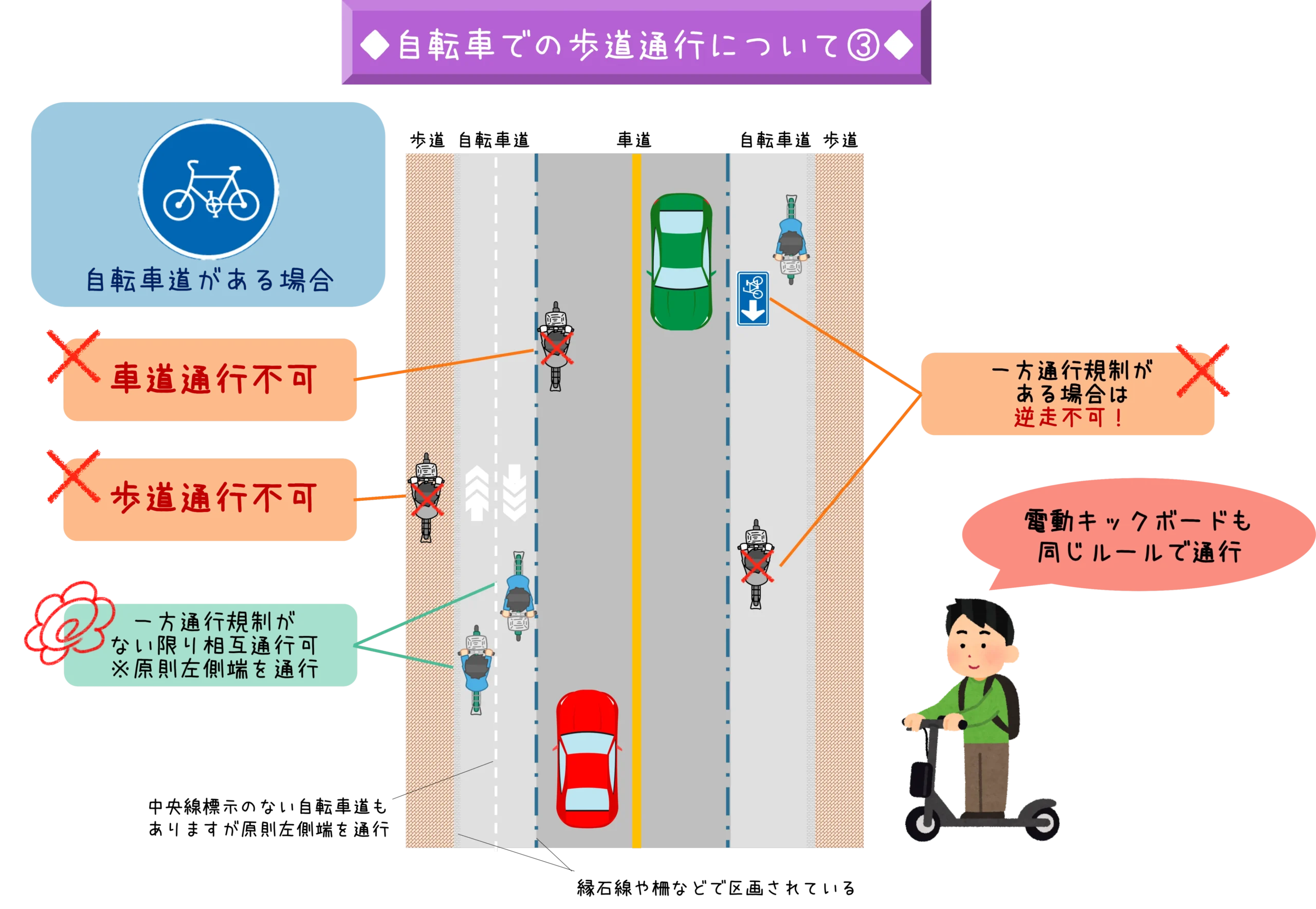 車道、歩道、自転車道の主な通行ルールをイラストを使いまとめましたので、ご参考になさってください。
